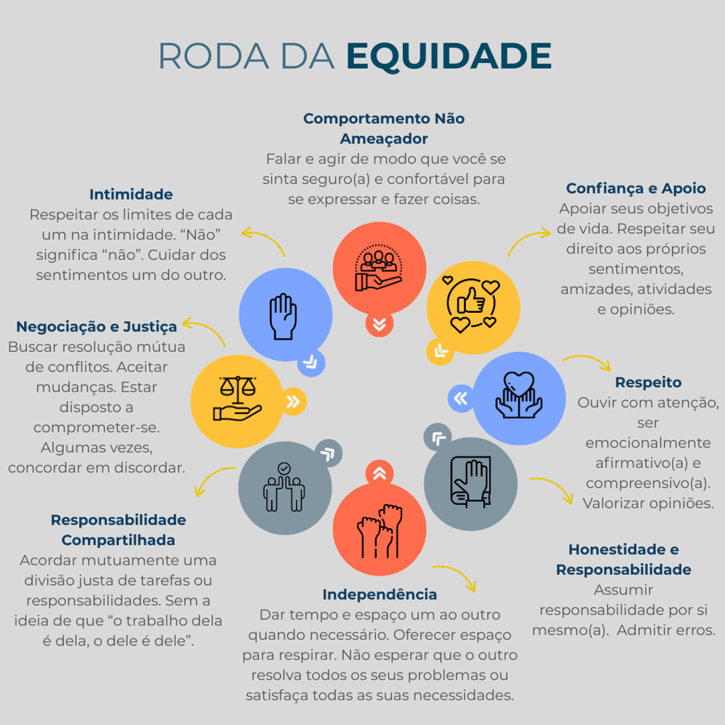 Criada como contraponto à conhecida “Roda do Poder e Controle” (Power and Control Wheel), a Roda da Equidade apresenta os pilares que sustentam uma relação respeitosa, justa e segura. Ela foi desenvolvida pelo Domestic Abuse Intervention Project, em Duluth (EUA), com base na escuta ativa de mulheres que vivenciaram relacionamentos abusivos.